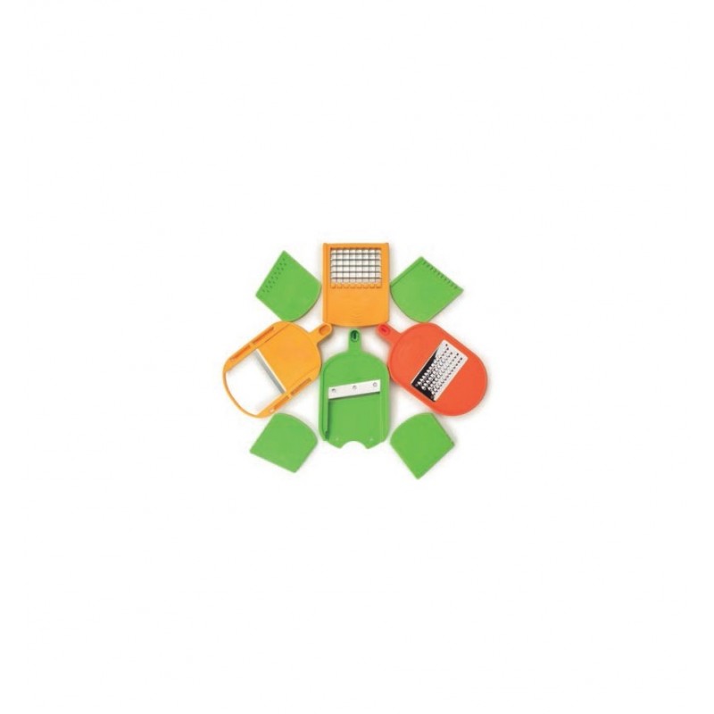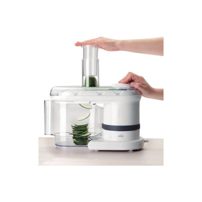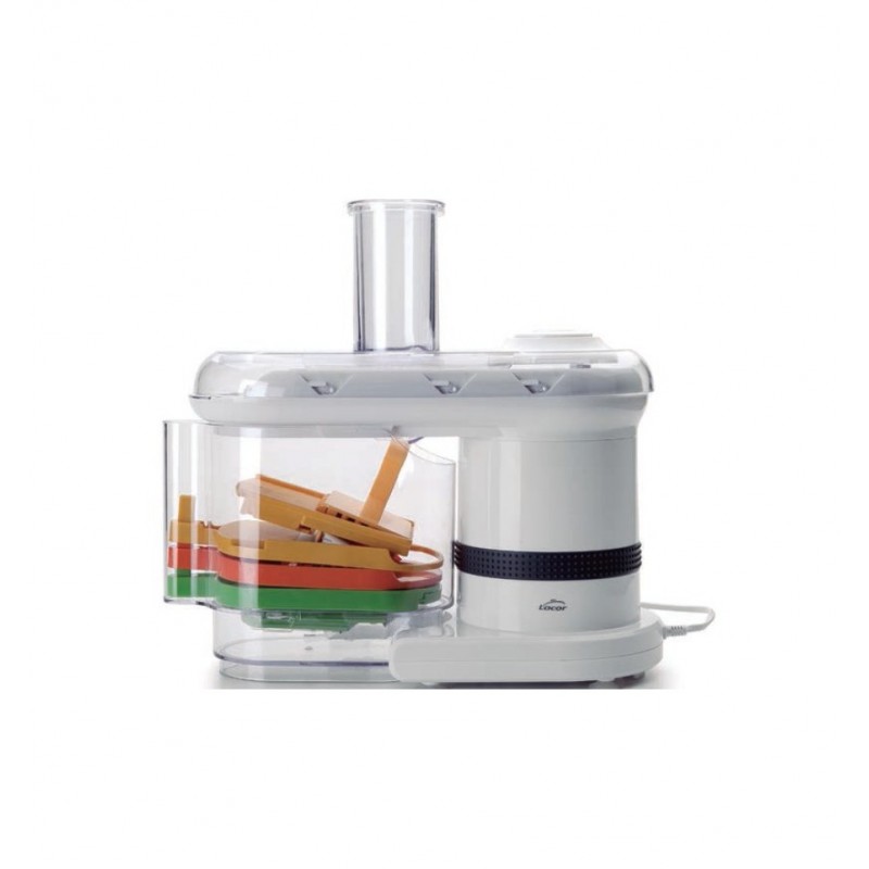 Mandolina eléctrica de Lacor que permite cortar y rallar gran cantidad de frutas y de verduras a gran velocidad. 6 tipos de corte y 2 litros de capacidad.