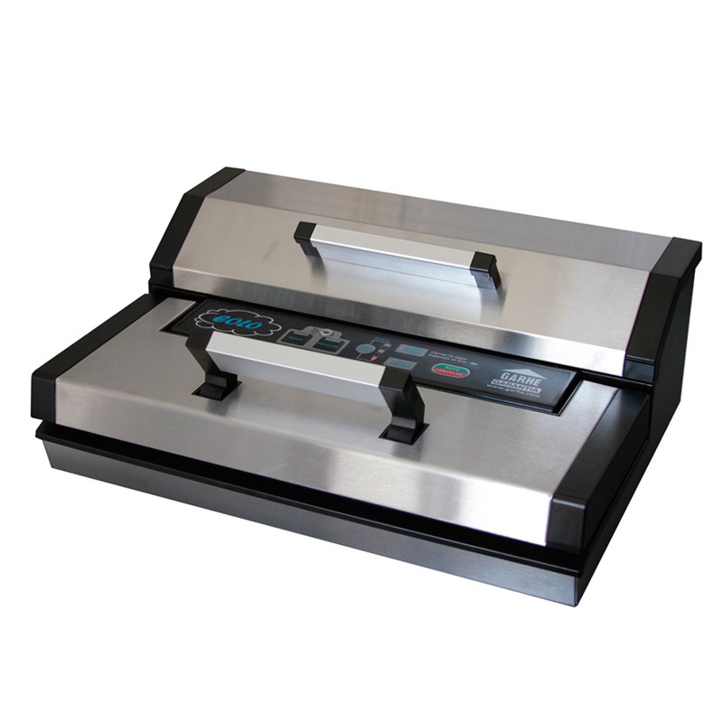 Envasadora semiprofesional automatica con cubierta inox, compartimento para rollos con cuchilla incorporada, bomba de doble cuerpo y barra de sellado de 3mm con posibilidad de realizar incluso sellado doble.
