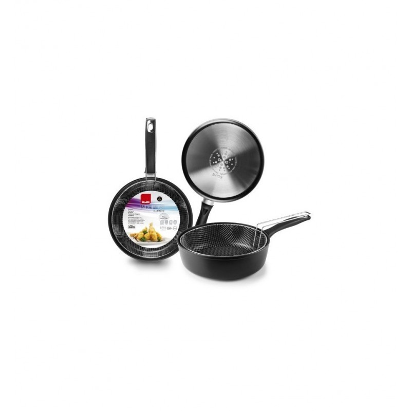 La freidora con cestillo New Induplus de Ibili está fabricada en aluminio fundido de 5 mm de espesor, cubierta con dos capas de antiadherente libre de PFOA y acabada con un mango de baquelita soft touch para más comodidad en el agarre.