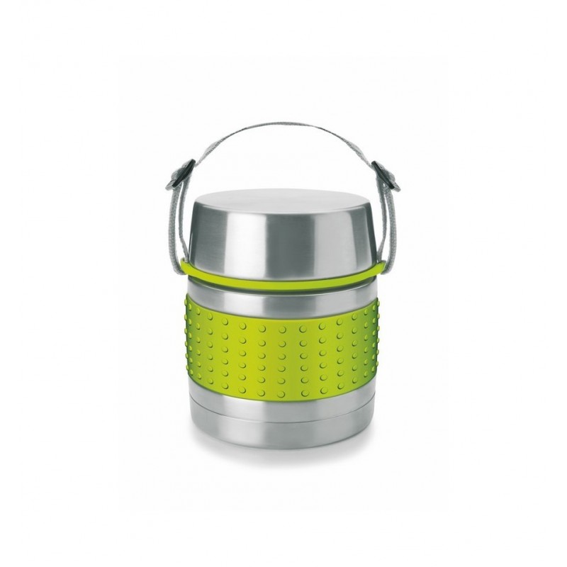Termo de doble pared en inox 18/10, con contenedor de plastico interior. Goma de siliciona para mejorar el agarre.