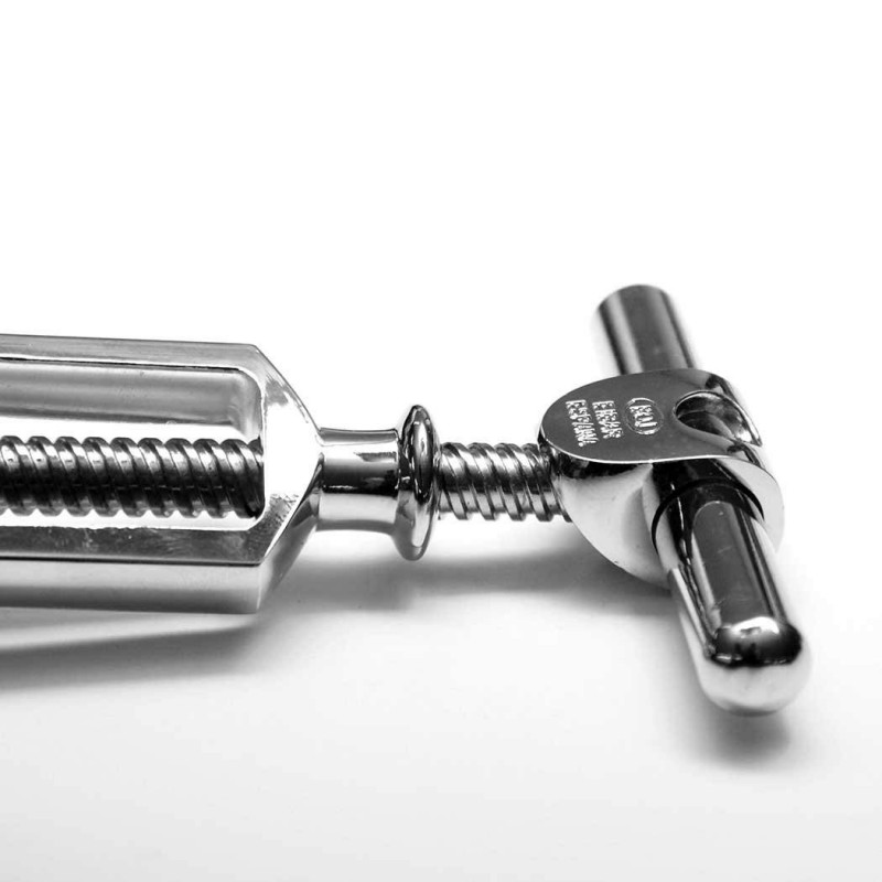 • El funcionamiento es sencillo: gire la manivela superior en un sentido hasta que la punta entre en el corcho hasta la profundidad deseada. Entonces levante el pequeño soporte superior para que la rosca pueda entrar en él y siga girando en la misma dirección que anteriormente. El propio giro hace que el corcho se extraiga