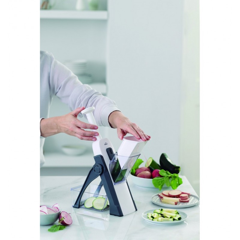 Mandolina Vertical regulable. Ahorra tiempo gracias a su corte fácil, rápido y seguro. Su cuchilla extremadamente afilada proporciona un corte homogéneo y preciso.