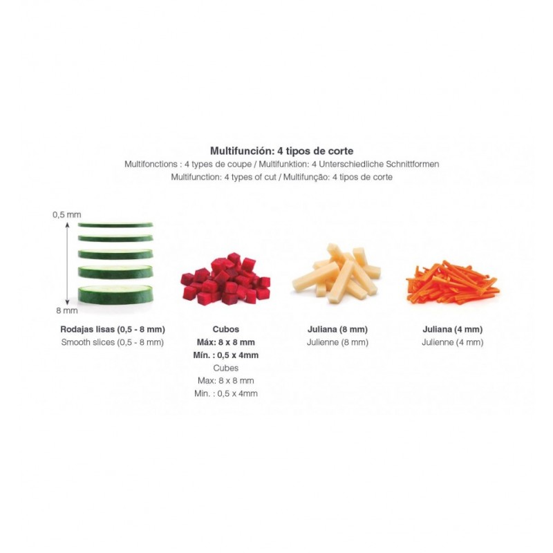 Tipo de corte: Corte liso/rodajas regulable de 0,5 - 8 mm / Corte en juliana 4 mm