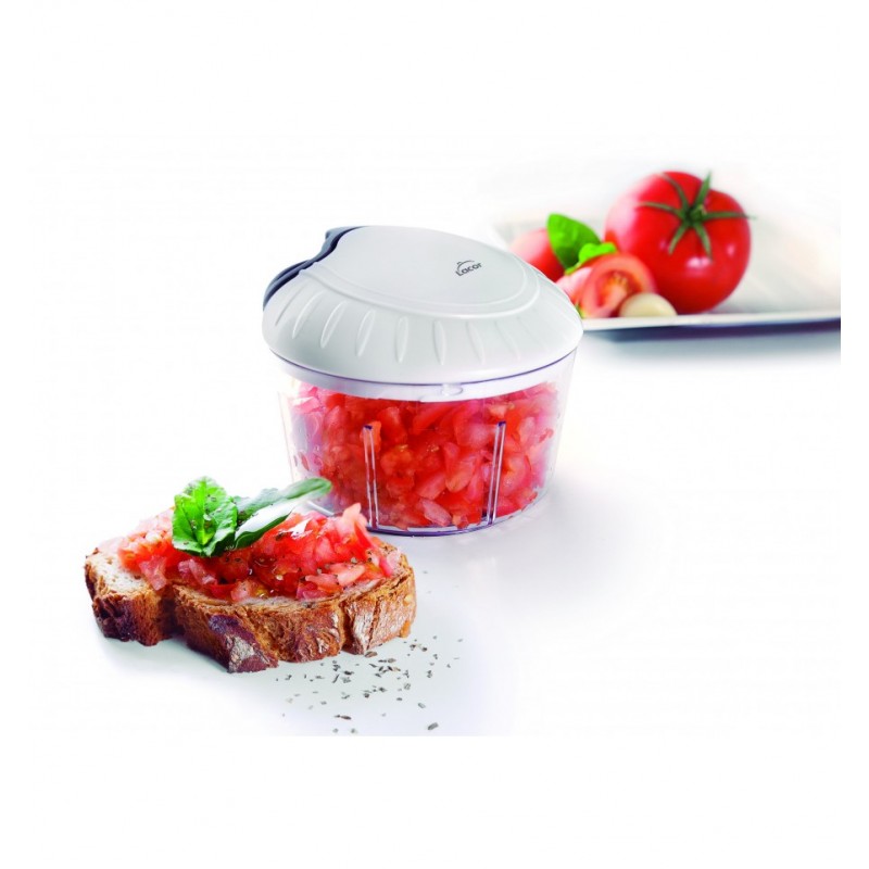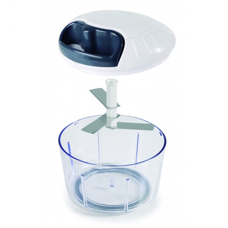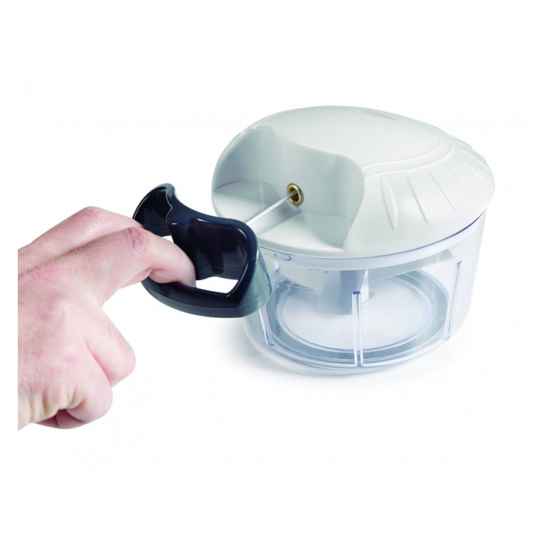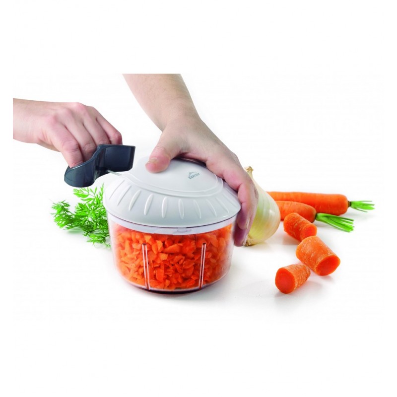 Picadora de mecanismo manual que pica todo tipo de alimentos, como verduras, frutas, jengibre, ajo, cebolla, frutos secos y hierbas. Su diseño ergonómico lo convierten en el picador perfecto para quienes desean un cortador de verduras que sea compacto, sencillo y cómodo de utilizar.