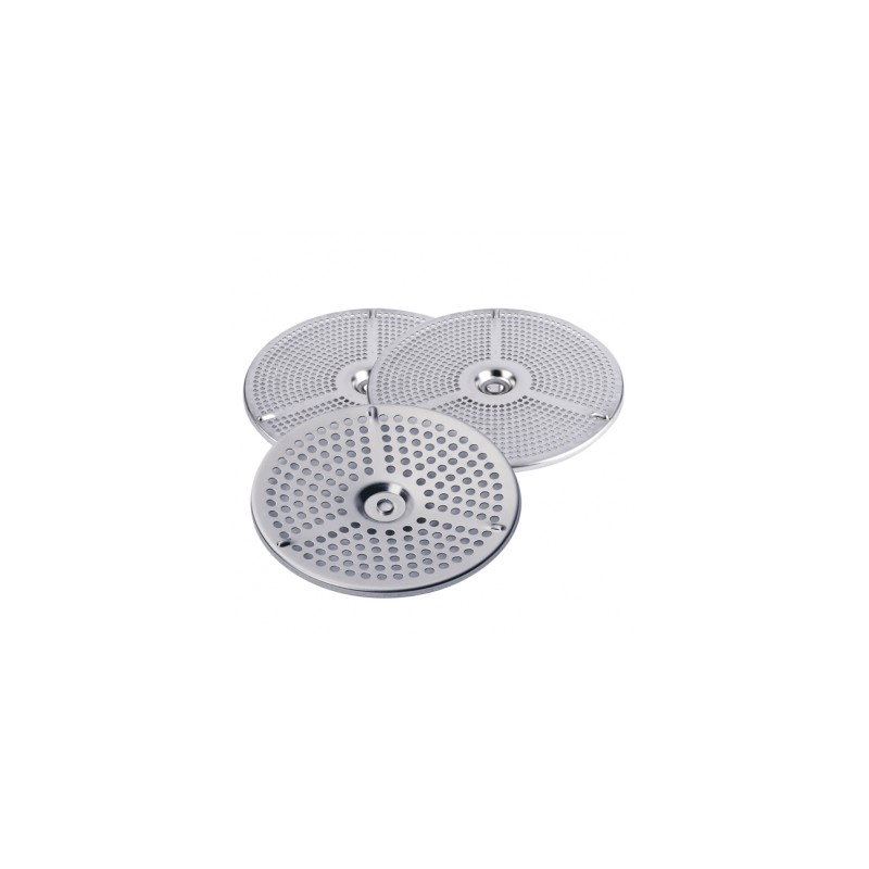 Pasapuré de acabado brillo con patillas de doble soldadura y pomo de santoprene, cuchilla soldada y 3 discos.